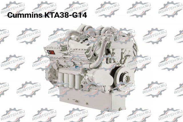 Cummins KTA38-G14 – высокомощный промышленный дизельный двигатель генераторного назначения V-образной 12-цилиндровой конфигурации под углом 60° объемом 37,8 литра производства совместного предприятия CCEC (Chongqing Cummins Engine Company) в Китае. Двигатель оборудован турбонаддувом Holset с промежуточным охлаждением воздуха (aftercooler), обеспечивающим постоянную мощность Prime Power 860 кВт (1153 л.с.) при 1500 об/мин для работы на частоте 50 Гц и 912 кВт (1223 л.с.) при 1800 об/мин для работы на частоте 60 Гц. Резервная мощность Standby Power составляет 950 кВт при 1500 об/мин (50 Гц) и 1000 кВт при 1800 об/мин (60 Гц). Максимальный крутящий момент 5475 Н·м достигается в диапазоне 1200-1500 об/мин с запасом момента 40%. Топливная система Cummins PT (Pressure Time) эксклюзивного низкого давления с компенсацией износа обеспечивает удельный расход топлива 210 г/кВт·ч. Максимальный расход топлива при номинальной нагрузке составляет 242-266 л/ч в зависимости от режима. Квадратная геометрия цилиндров 159×159 мм при степени сжатии 13,9:1. Блок цилиндров из высокопрочного чугуна со сменными мокрыми гильзами. Электронный губернатор класса точности G3 обеспечивает стабильную частоту вращения. Система смазки объемом 135-161 литров с полнопоточным фильтром. Жидкостное охлаждение с центробежным водяным насосом объемом до 307,7 литров (включая радиатор). Электростартер 24В. Ограничитель превышения оборотов 1850±50 об/мин. Масса около 4300-4500 кг. Ресурс 18000-20000 моточасов.