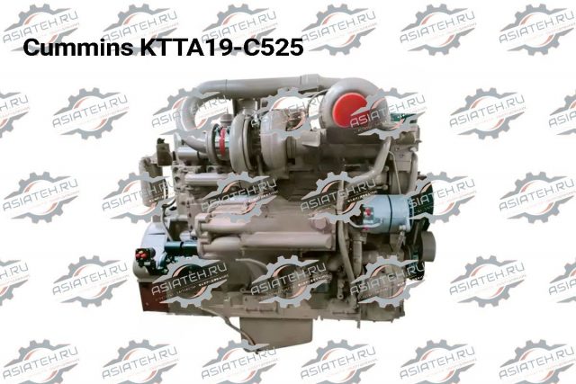 Cummins KTTA19-C525 (KTA19-C525) – промышленный дизельный двигатель рядной 6-цилиндровой вертикальной конфигурации объемом 19 литров производства совместного предприятия CCEC (Chongqing Cummins Engine Company), соответствующий экологическим нормам Евро-2. Двигатель оснащен турбонаддувом с промежуточным охлаждением воздуха (интеркулером), обеспечивающим максимальную кратковременную мощность 392 кВт (525 л.с.) при 2100 об/мин с крутящим моментом 1780 Н·м и максимальный крутящий момент 2237 Н·м при 1300 об/мин. Для непрерывной долговременной работы Prime Power двигатель развивает 318 кВт (426-432 л.с.) при 1800 об/мин с крутящим моментом 1686 Н·м и непрерывным моментом 1902 Н·м при 1300 об/мин. Топливная система Cummins PT (Pressure Time) с механическим насосом высокого давления и непосредственным впрыском топлива в цилиндры обеспечивает удельный расход топлива 210 г/кВт·ч. Квадратная геометрия цилиндров 159×159 мм при степени сжатия 13,9:1 гарантирует эффективное сгорание и соответствие экологическим нормам Евро-2. Холостые обороты 650 об/мин, максимальные безопасные обороты без нагрузки 2450 об/мин, максимальные обороты на износ 2625 об/мин. Механическая система управления с губернатором. Жидкостное охлаждение с принудительной циркуляцией объемом 30 литров антифриза. Электростартер 12/24В обеспечивает запуск при температурах до -12°C без вспомогательных систем. Масса 1700-2073 кг в зависимости от комплектации при габаритах 2151×966×1704 мм. Ресурс 15000-18000 моточасов.